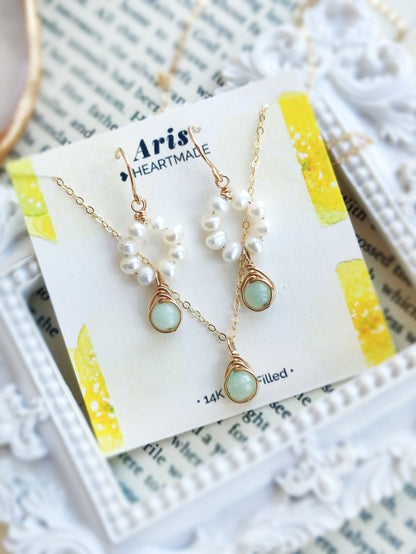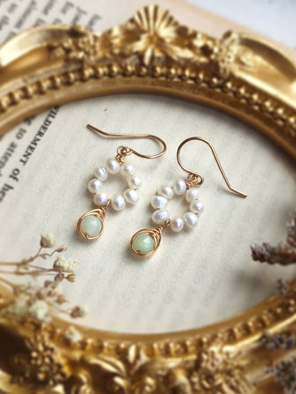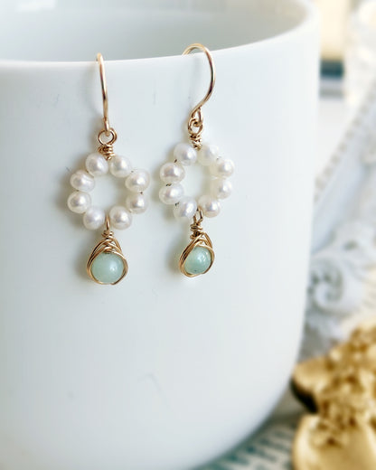 Dainty and delicate small pearl earrings with tiny white pearls & amazonite gemstones. With choices of 14K gold filled, rose gold filled, and sterling silver. Perfect jewelry as a gift for her.