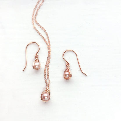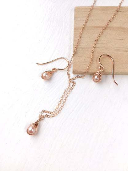 Dainty Pink Pearl Jewelry Set, Rose Gold Earrings and Necklace Set