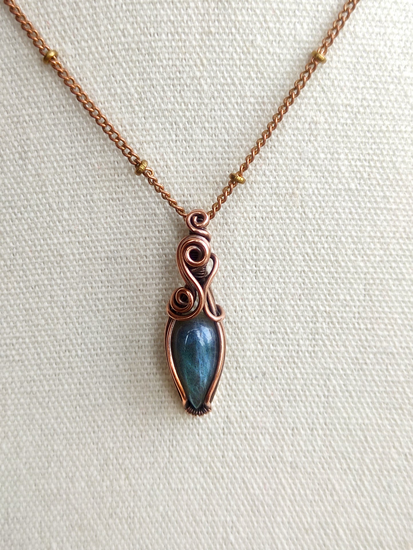 Magical and petite 🔮 This is a tiny pendant with blue flash labradorite gemstone. The beautiful blue color shines at certain angles. The bail is intricately wrapped with a swirly design. The metal is solid copper wire that has been oxidized & shined for an antique look.
