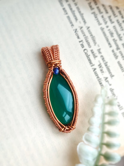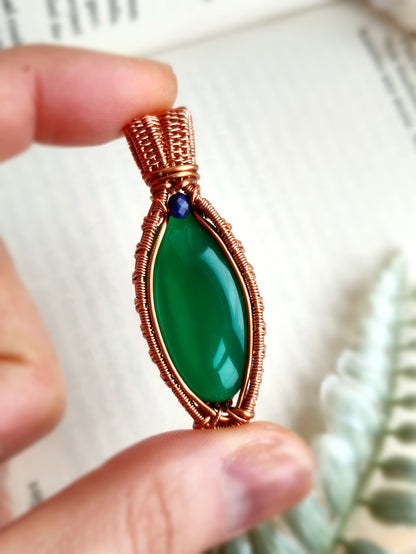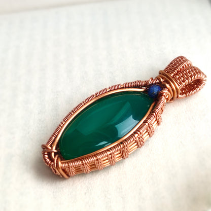 This intricate pendant is handmade with a natural Green Onyx gemstone adorned with a lapis lazuli bead. The metal part is solid copper.