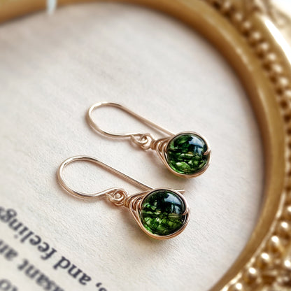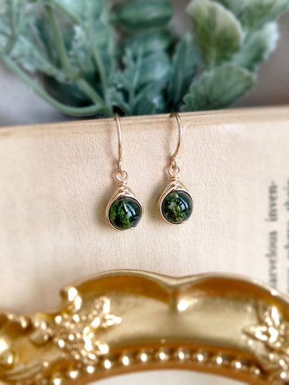 Dainty earrings with 6mm natural ghost phantom quartz crystal beads. Unique earrings with beautiful moss green pattern inside clear quartz crystal.