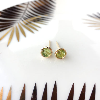 💚 Tiny Green Peridot 14K Gold Filled Wire Wrapped Stud Earrings (4mm) 💚