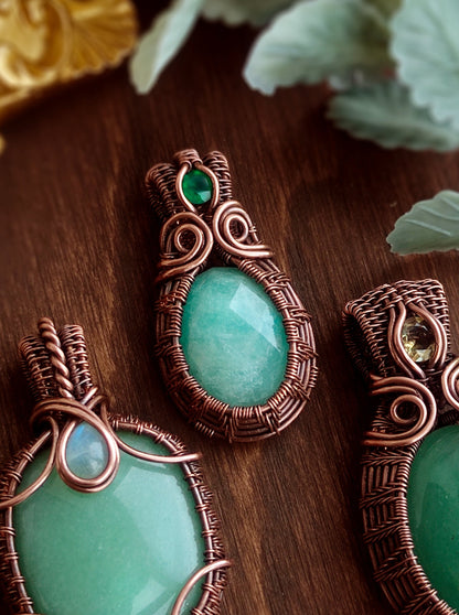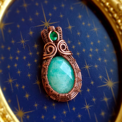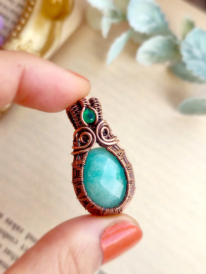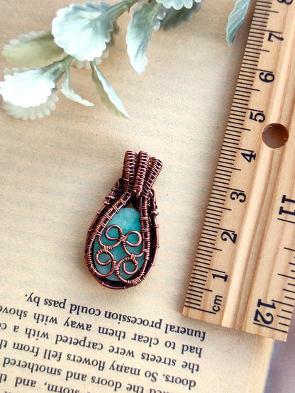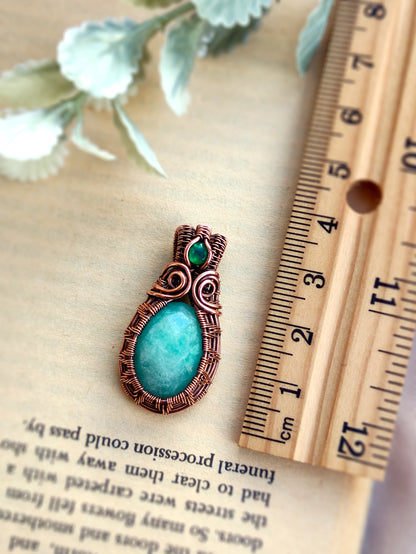 Amazonite and Green Onyx Wire Wrapped Pendant in Copper