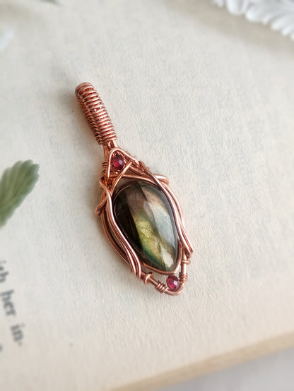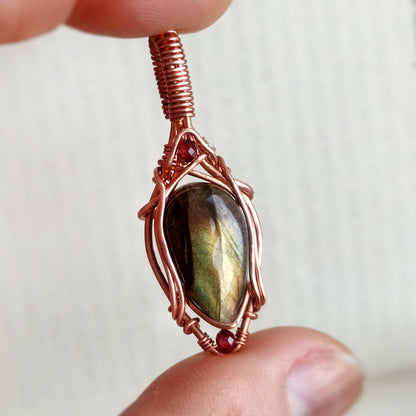 Dainty Elven Labradorite and Garnet Pendant in Solid Copper