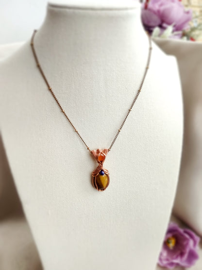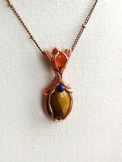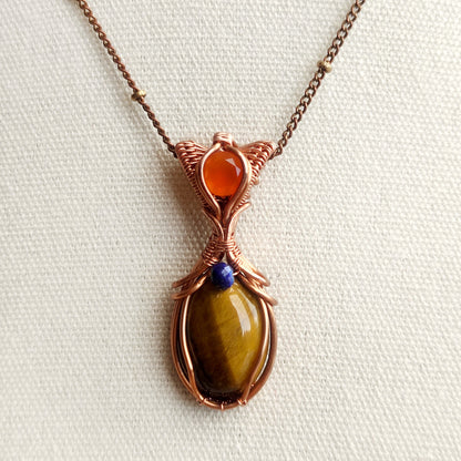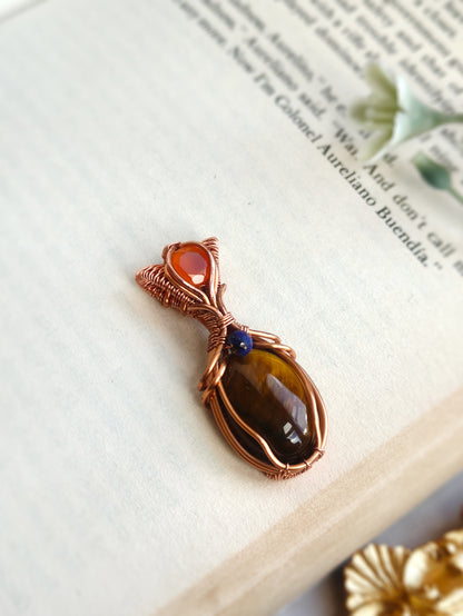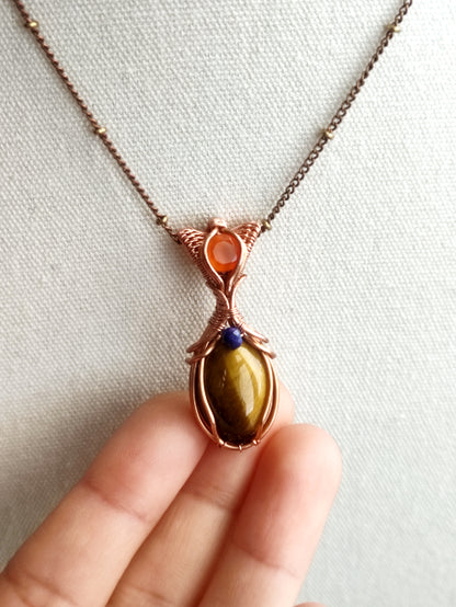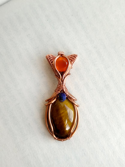 This wire-wrapped pendant is made with a natural Tiger's Eye gemstone. The bail is adorned with a faceted Carnelian gemstone. Finishing with a small Lapis Lazuli bead.