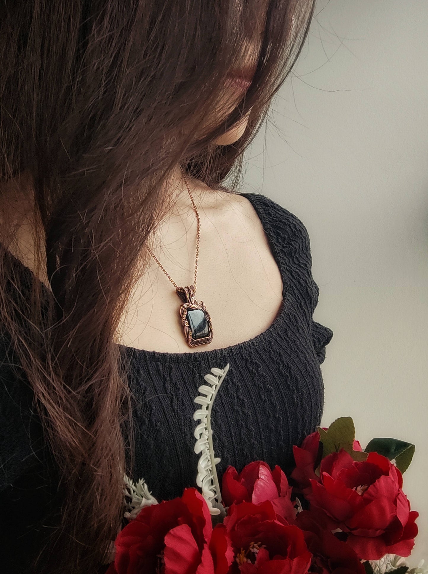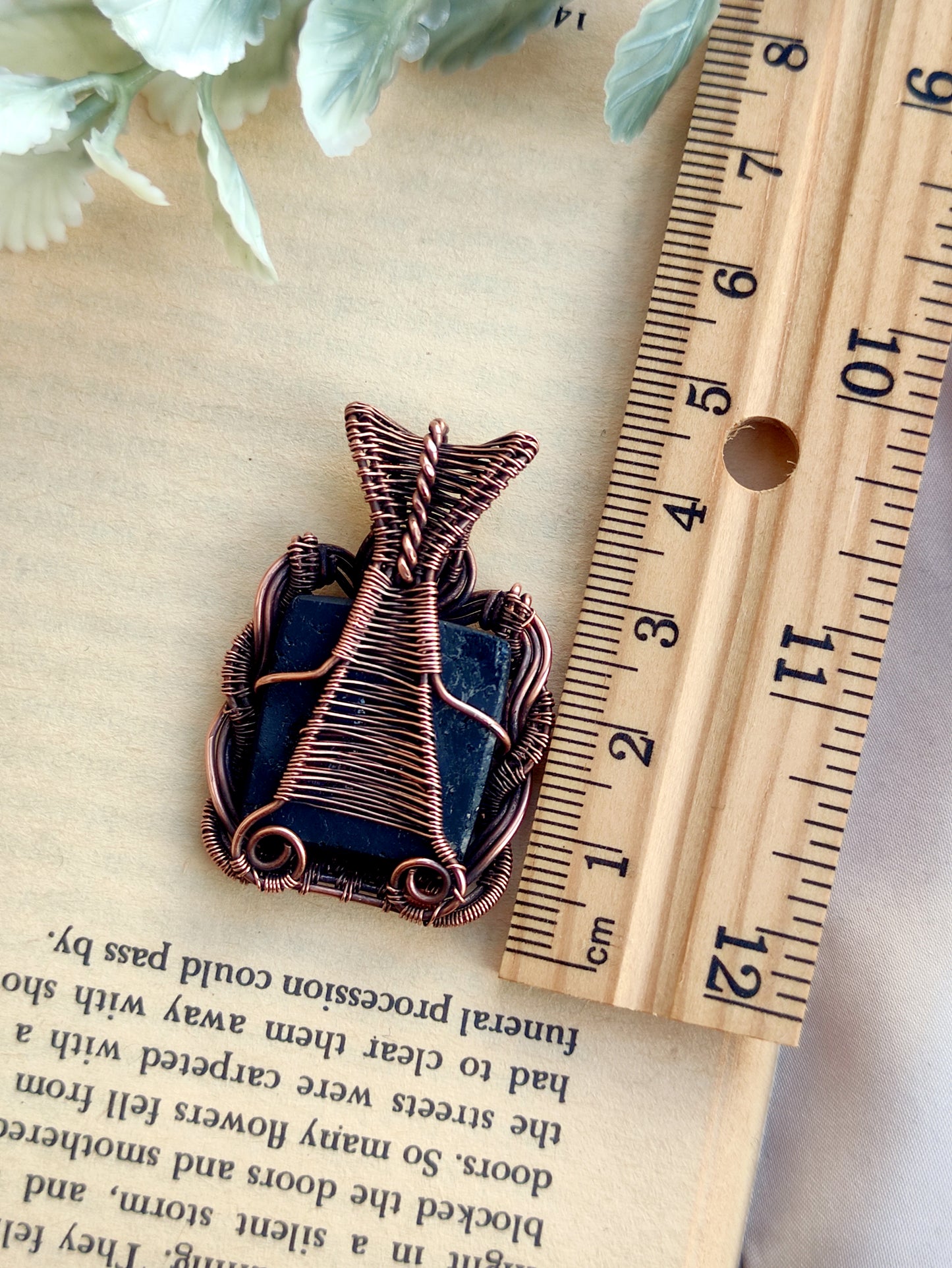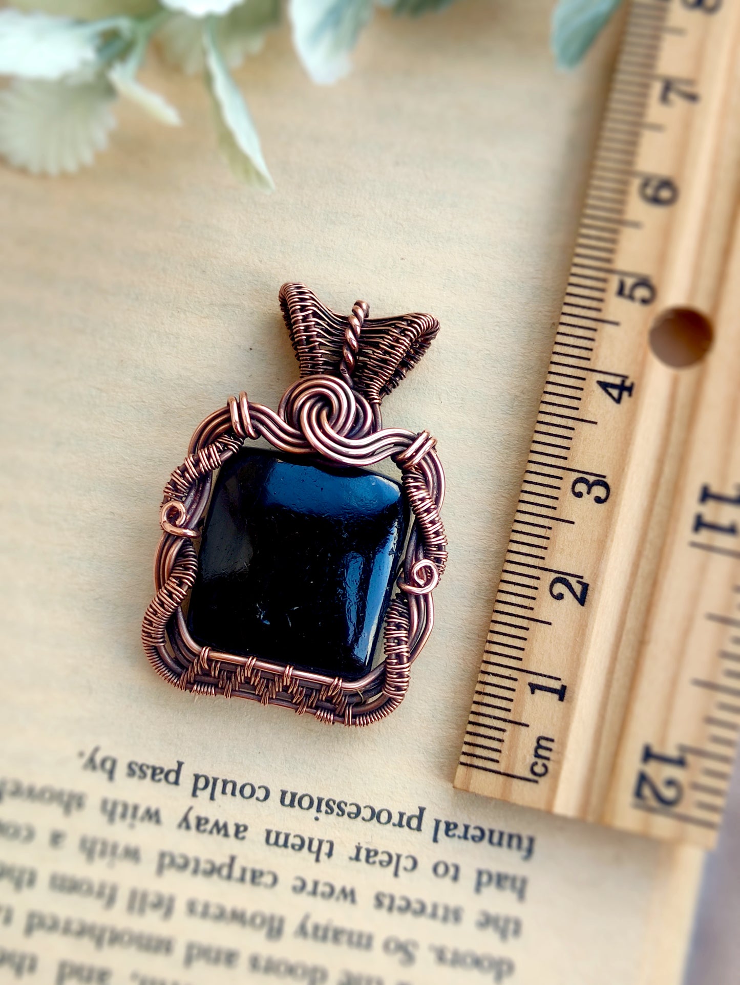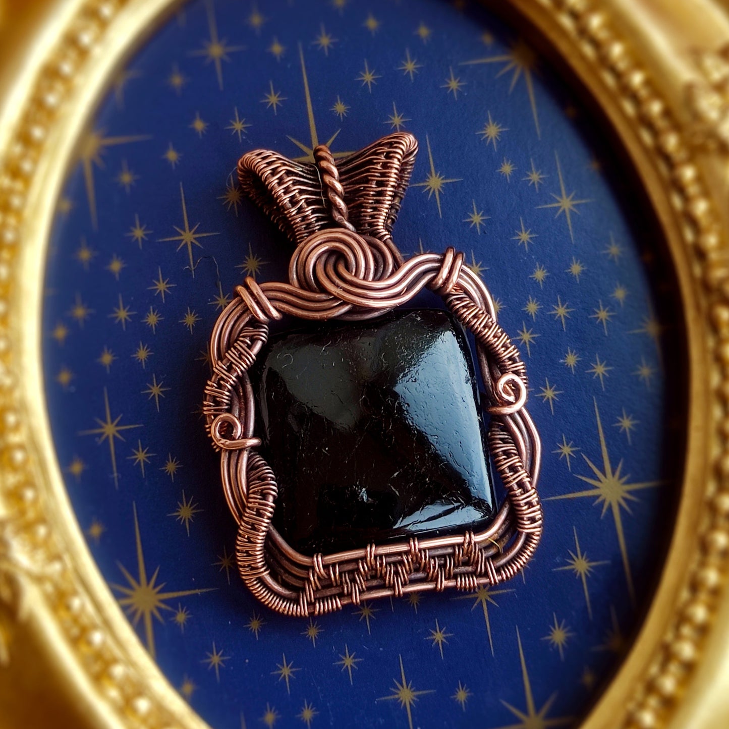 This is an elegant square-framed pendant with black tourmaline. The intricate wire-wrapped frame creates a piece that is Victorian/Gothic-inspired with an artistic twist. The frame is handmade with copper, which has been oxidized for an antique look.