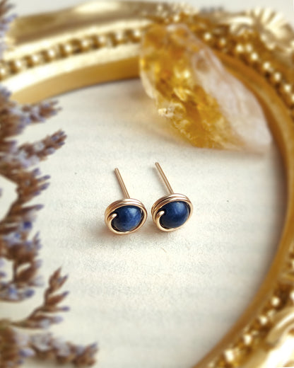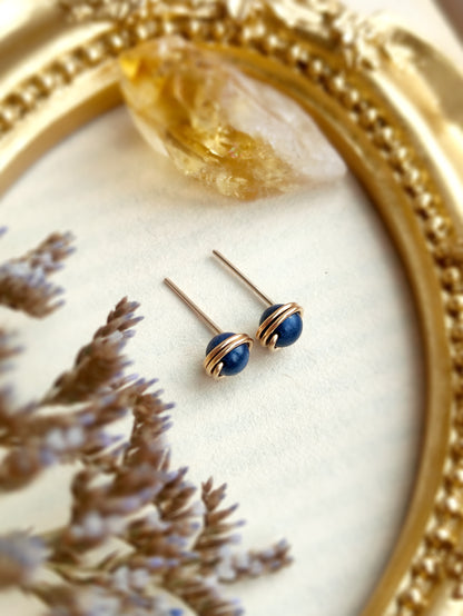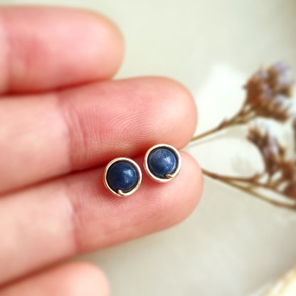 Gemstone size: 4mm These wire-wrapped stud earrings are handmade with Sapphire beads and 14K gold-filled, Rose Gold Filled or Sterling Silver wire.