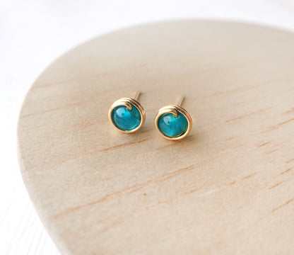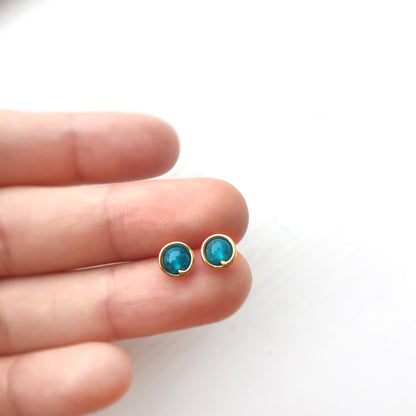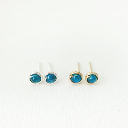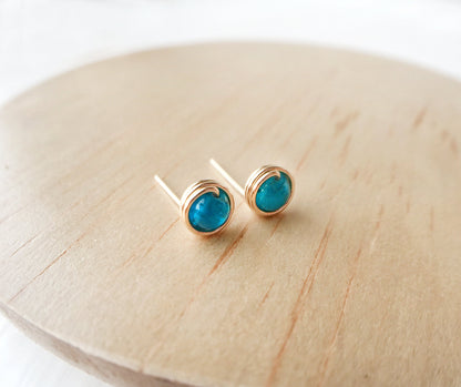 💙 Tiny Blue Apatite Stud Earrings with 4mm natural teal Apatite beads and choice of 14K gold-filled/ Rose Gold Filled and Sterling Silver wire.