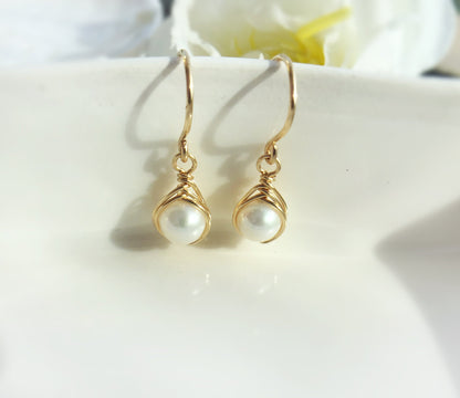 Dainty White Pearl Dangle Earrings 14K Gold Filled, Small Pearl Earrings
