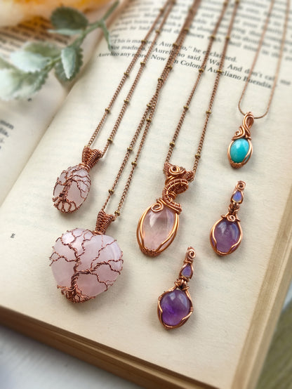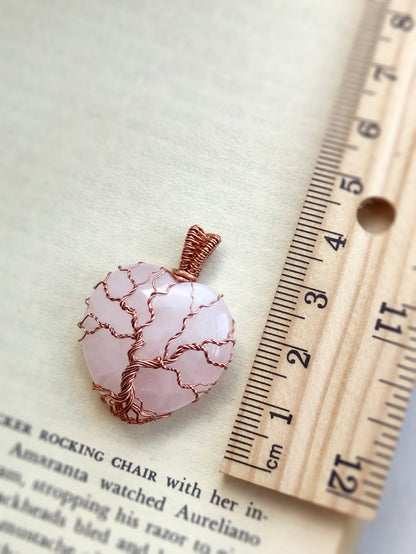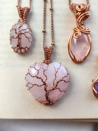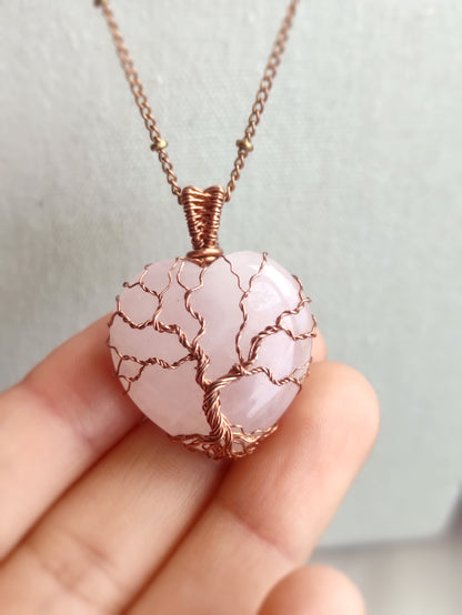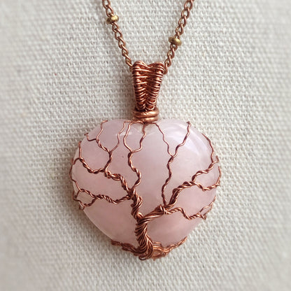 This Tree of Life pendant is handmade with a heart-shaped natural rose quartz stone. The metal part is bare copper.
